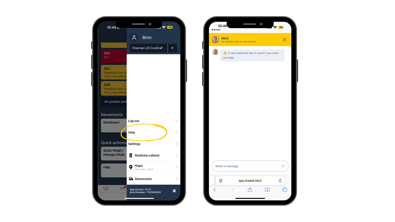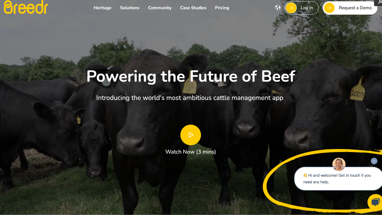 Click the chat box icon on the bottom right of the screen when looking at the Breedr website, the web portal, or the help guides.