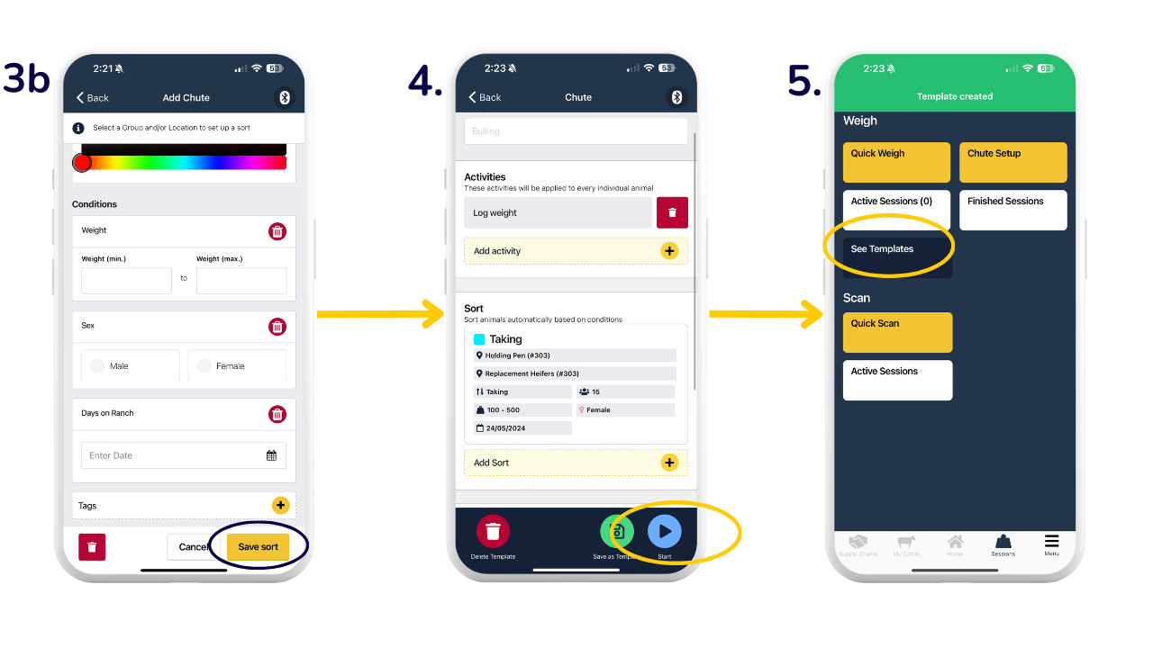 Chute Setup is a functionality where you can set up conditions in which you want to sort your animal/s into pre-recorded groups and/or a location. You can process animals right away following setting up the chute session or save as a template to use for future processing sessions. You can sort based on an animal's weight, sex, tag applied or date on ranch.