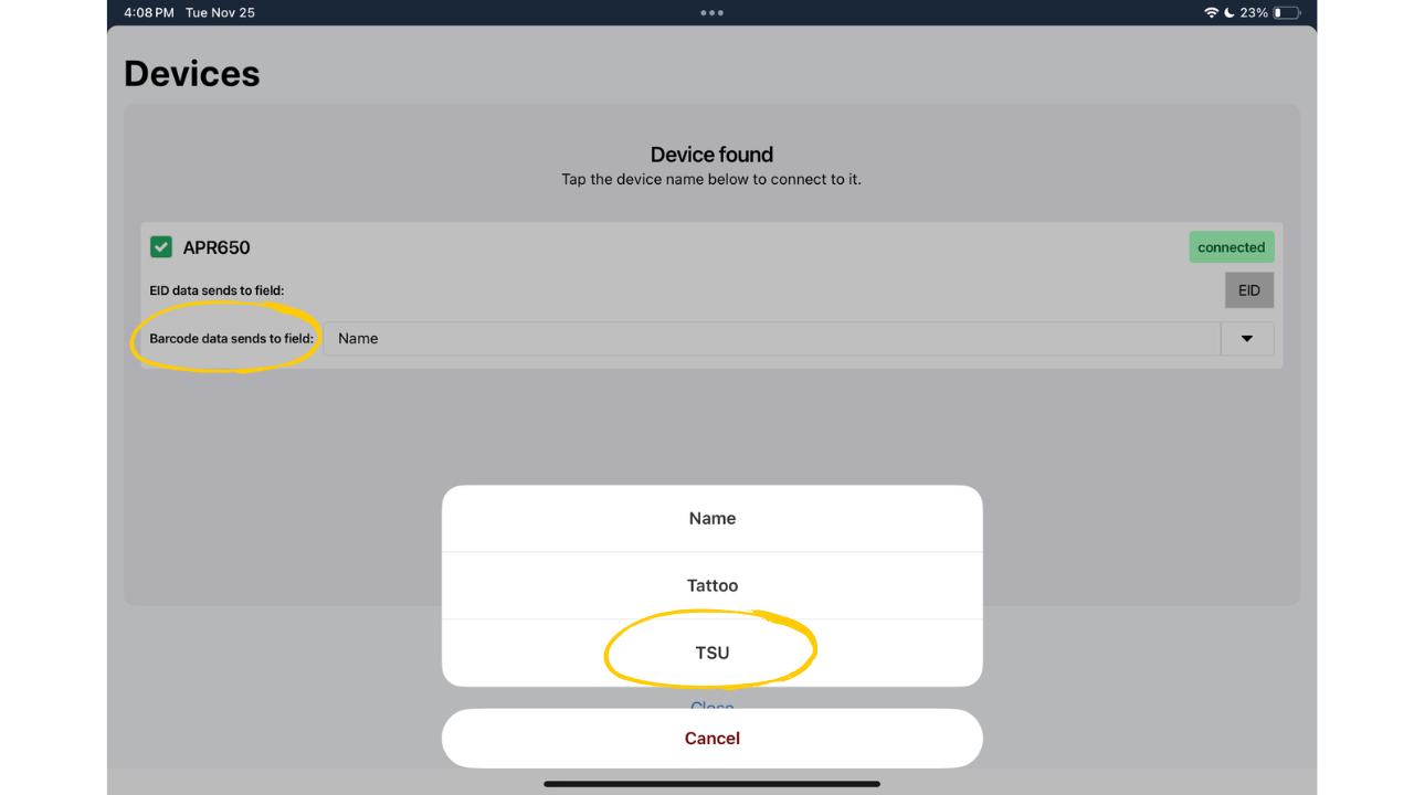 4. In the drop down menu, select the ID field you'd like the barcode scanner to go to in the Breedr app. For example, if you're scanning TSU barcodes, select TSU barcode.