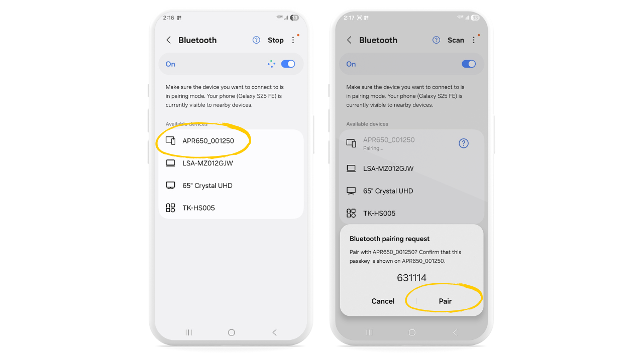 6. When you receive a 'Bluetooth Pairing Request' for the APR650 device, click 'Pair'. The passkey displayed on your mobile device and the APR650 device should match.