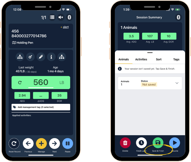 When you have finished scanning all your animals, tap the blue Pause button and select 'Save and finish.'