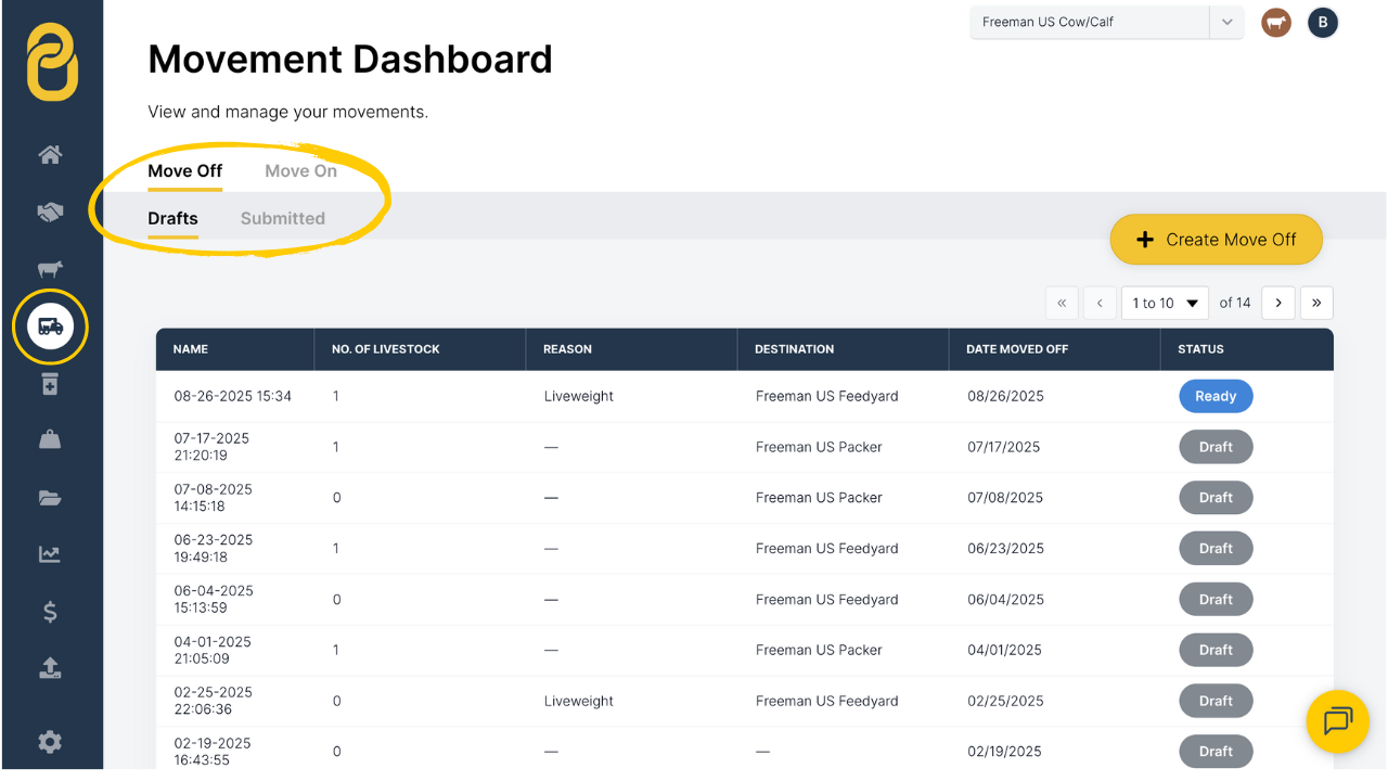 Movements can help you keep track of key shipment information, including number of livestock, reason for move-off, destination, and date moved off. Movement Drafts are designed to be created in advance for review before submission and can be viewed on the mobile app and the web portal.