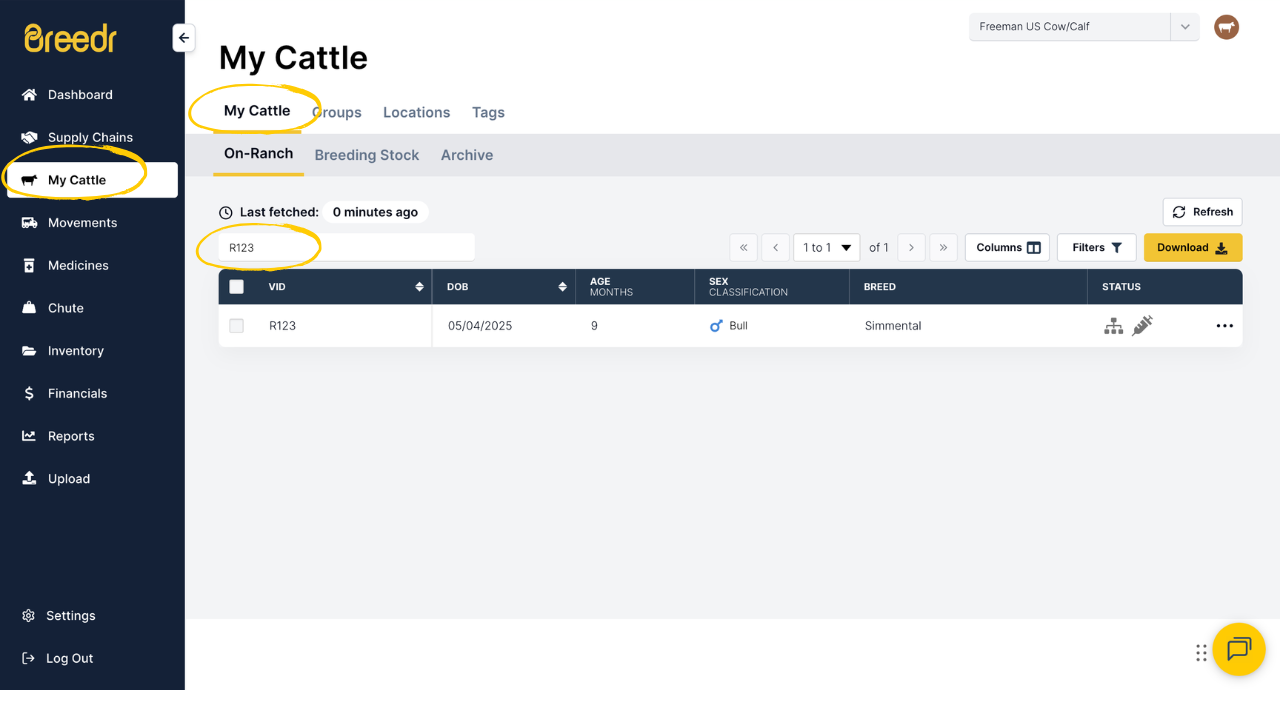 Ensure you're on the 'My Livestock' tab of the 'My Cattle' page, use the search bar to find the animal you're looking for using its primary or secondary ID (Set in Settings under Animal IDs).