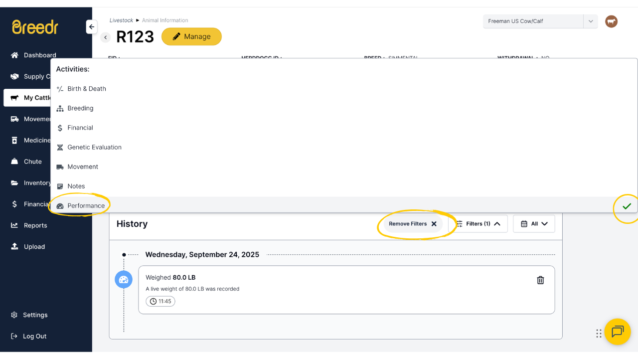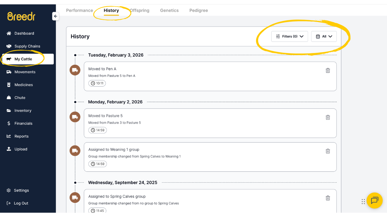 Ensure you're on the 'My Cattle' page, and click on the animal you'd like to see an activity history for.