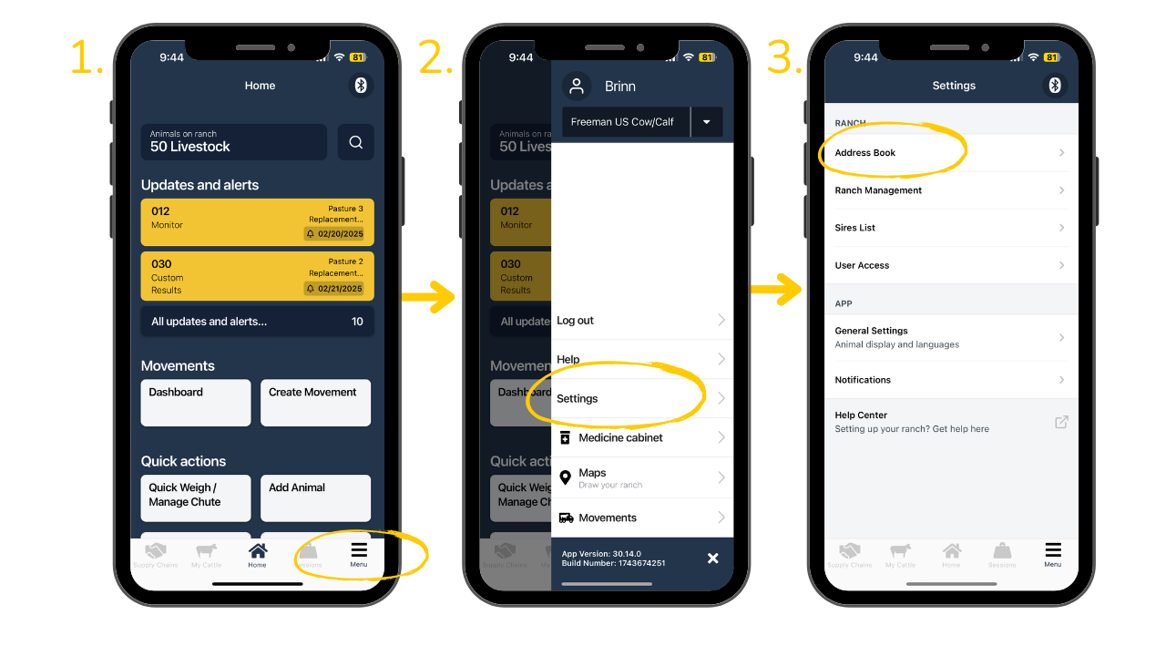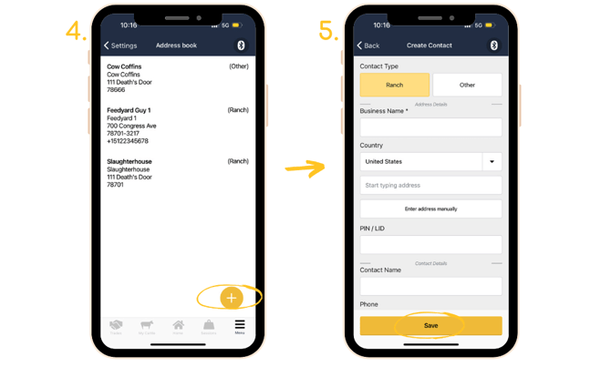 Having all your contacts in one spot is like having your cattle in a single, well-fenced pasture – easy to round up when needed. Using Manage Contacts, you can add business names, contacts, phone numbers, and addresses for people you want to keep in your circle. These are also the contacts you can use to send and receive animals from.