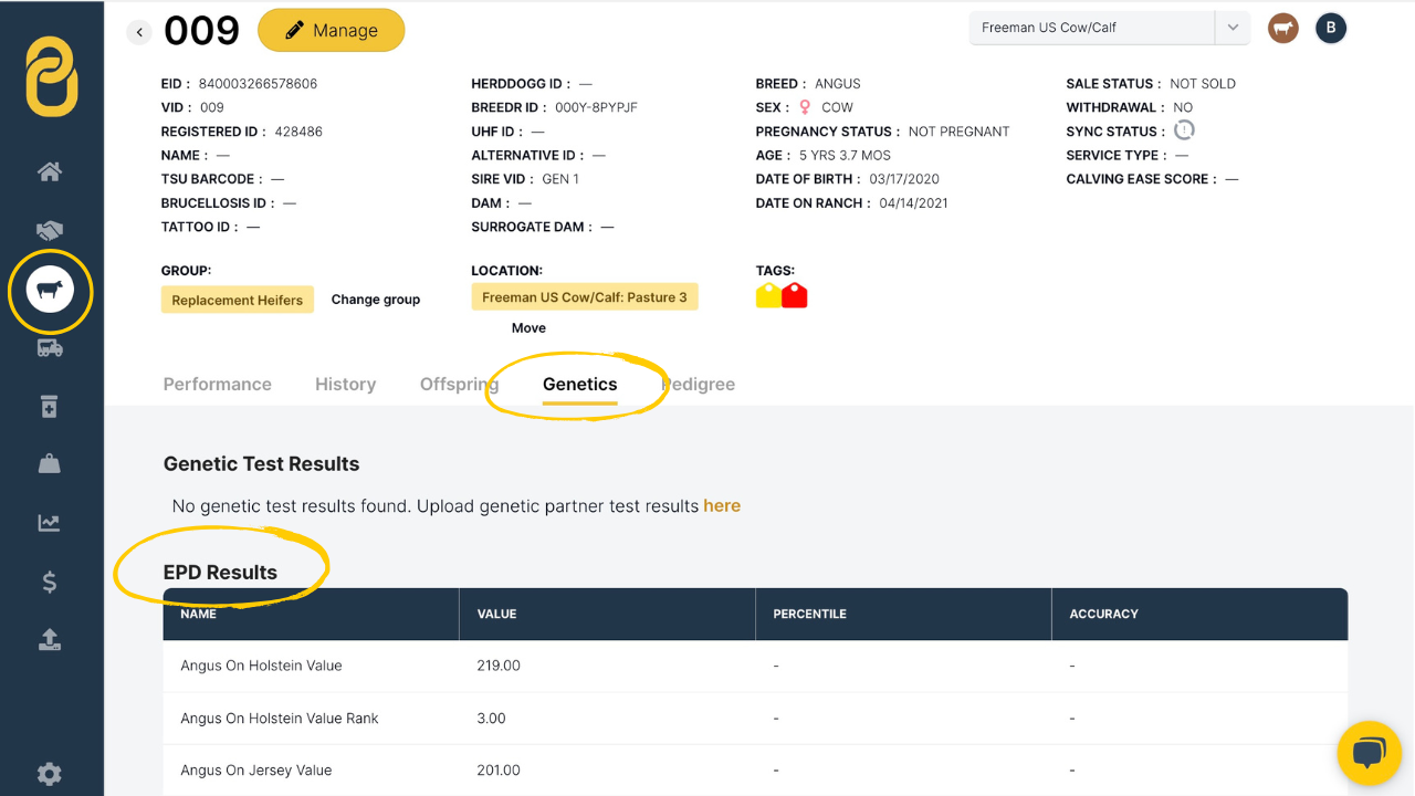 - You can view the information by navigating to the individual animal and clicking the Genetics tab.