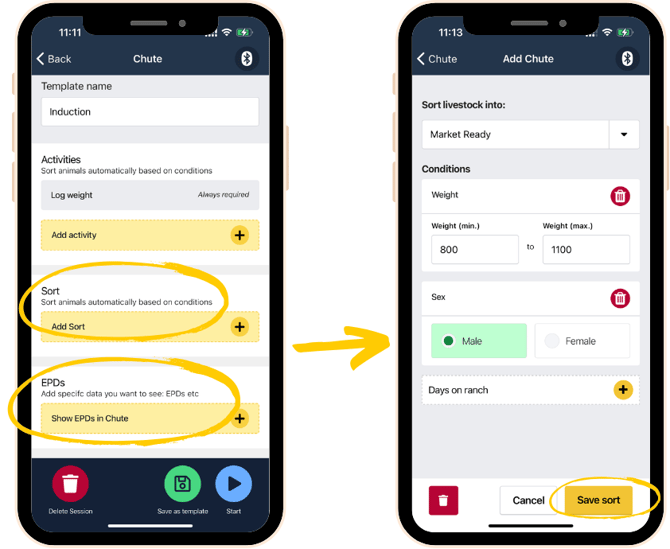 To begin a new sort, tap the yellow + icon to add a parameter. Choose whether you would like to sort into groups or locations, and then choose the conditions. Conditions can be weight, sex, and days on ranch and tags.